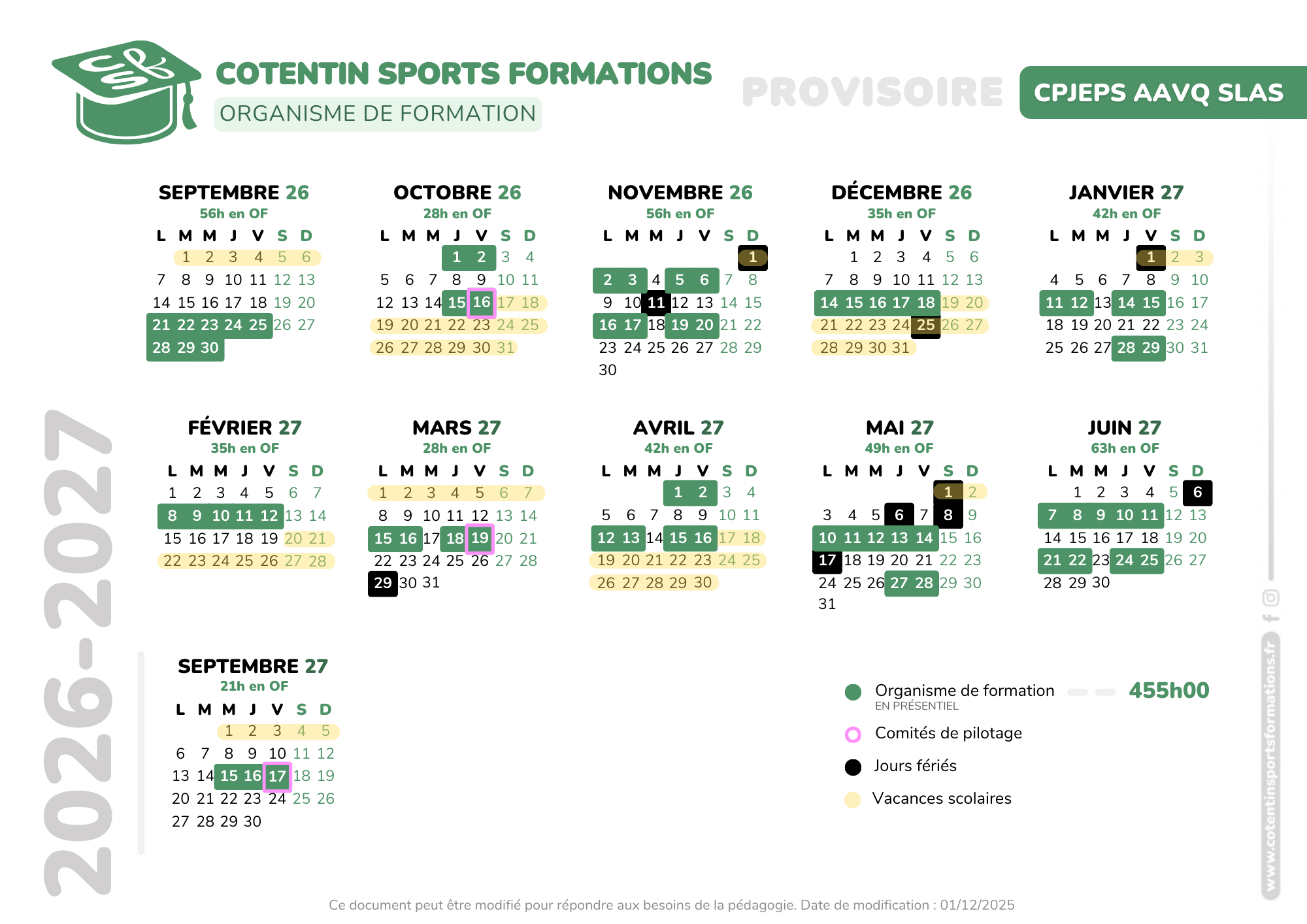La formation dure une année de septembre à septembre.